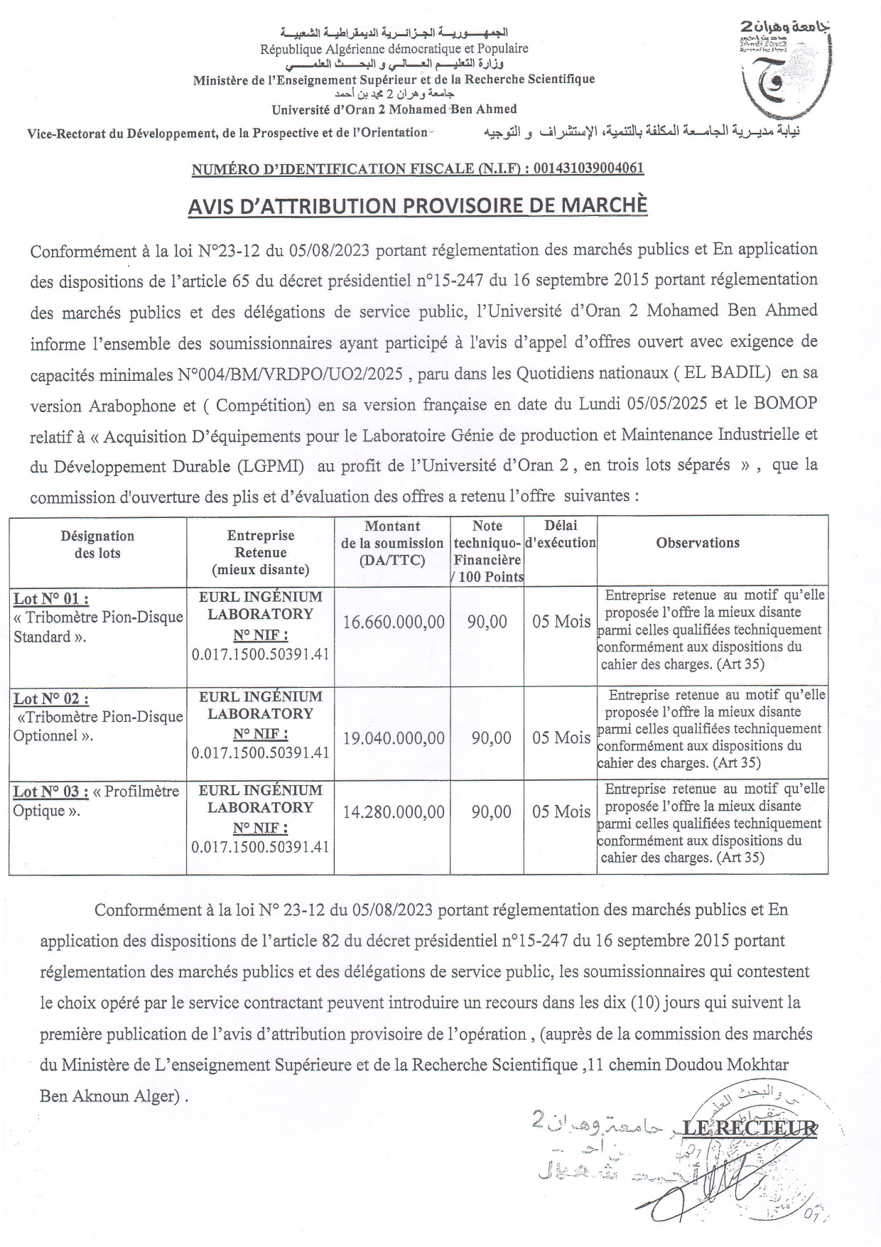 AVIS ATTRIBUTION PROVISOIRE DE MARCHE- Acquisition d'équipements pour le laboratoire Génie de production et Maintenance Industrielle et du Développement Durable (LGPMI)