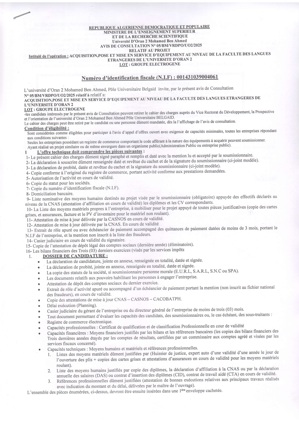 Avis consultatio-Acqst,pose et mise en service equip au niveau de la FLE -UO2 -GROUPE ELECTROGENE