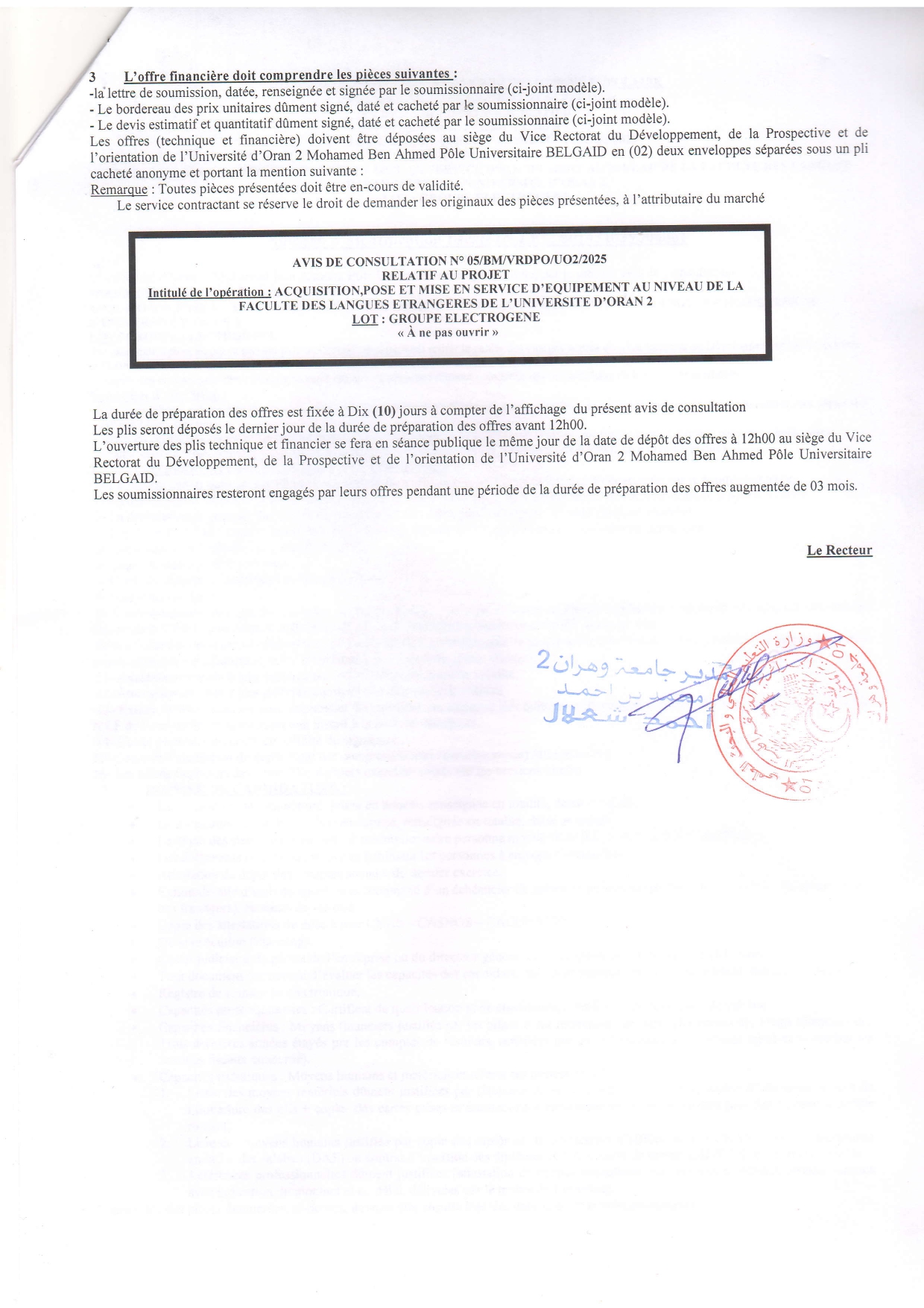 Article suivant : Compléments d'équipements de 1000 places pédagogiques au profit de l'UO2 Mohamed Ben Ahmed. LOT N°02: Fournitures; Pose et Mise en service des Equipements de Climatisation.
